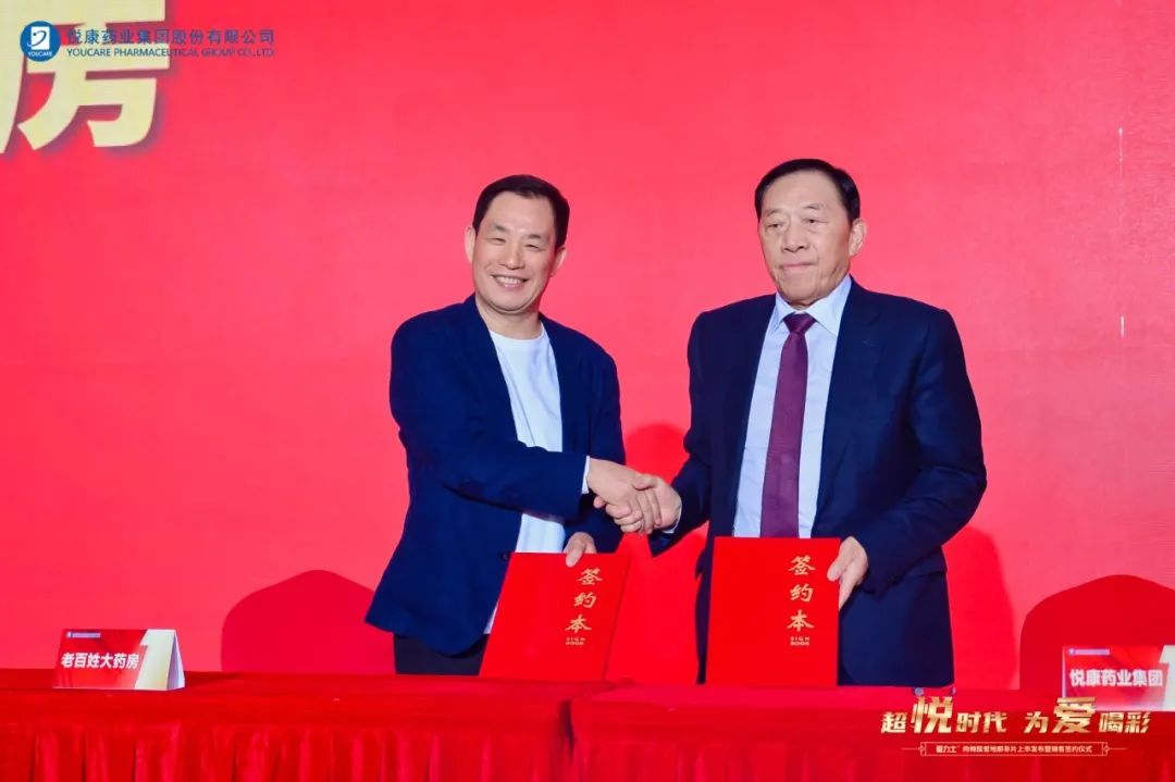 老百姓大药房连锁股份有限公司董事长谢子龙(左)与悦康药业集团股份有限公司董事长于伟仕(右)现场签约