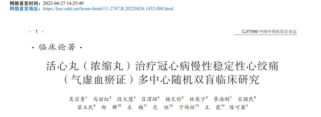 2018年,悦康药业集团申办了一项评价悦康®活心丸(浓缩丸)治疗冠心病慢性稳定性心绞痛(气虚血瘀证)的随机、双盲、阳性药平行对照、多中心临床研究,以评价其治疗冠心病慢性稳定性心绞痛(气虚血瘀证)的有效性及安全性,旨在进一步证实中医辨证下的精准用药对疗效的影响。2022年4月27日,该研究成果网络首发在双核心期刊《中国中西医结合杂志》上。