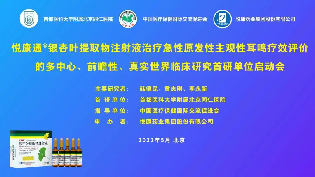2022年5月14日,由悦康药业发起的悦康通®治疗原发性耳鸣真实世界临床研究首研单位启动会在北京举行,本次启动会成为悦康通®银杏叶提取物注射液自2021年10月10日开展真实世界临床研究以来一次重要里程碑,标志着悦康通®治疗原发性耳鸣的真实世界临床研究正式开始入组受试者。