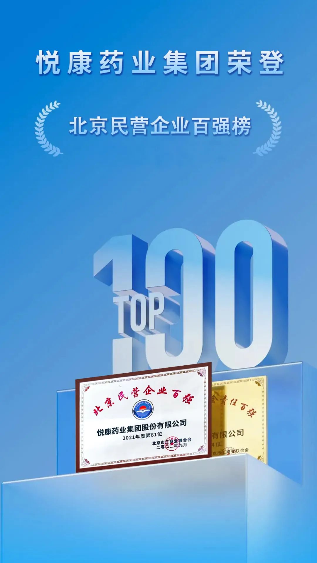 9月26日,北京市工商联在京举行发布会,正式发布2022北京民营企业百强榜单。悦康药业集团凭借创新的经营战略、稳健的盈利模式和对社会责任的有力担当,成功入选“北京民营企业百强”并荣登榜单第81名。
