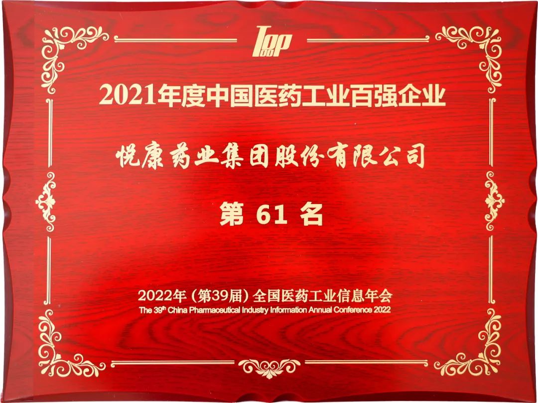 21年度中国医药工业百强榜“,位列第61位;并荣获”2022年中国医药研发产品线最佳工业企业“称号。