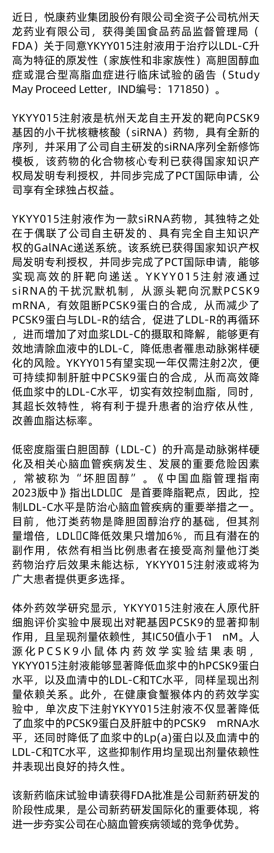 悦康药业超长效降脂小核酸药物YKYY015注射液获得FDA临床试验批准
