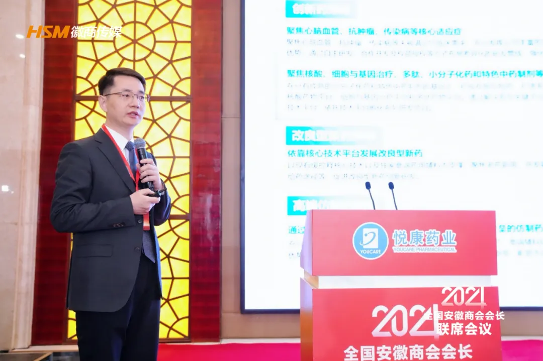 于伟仕董事长在致辞中表示,“党的十八大以来,总书记三次考察安徽,‘科创’主题贯穿始终。作为从家乡走出的创业者,我所创立的悦康药业始终将‘科创’作为核心发展要义,我想这也是徽商企业所努力追求和正在实践的一个缩影。”