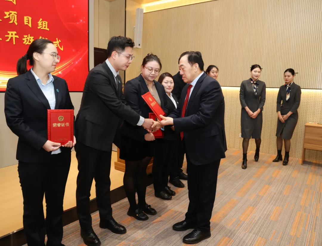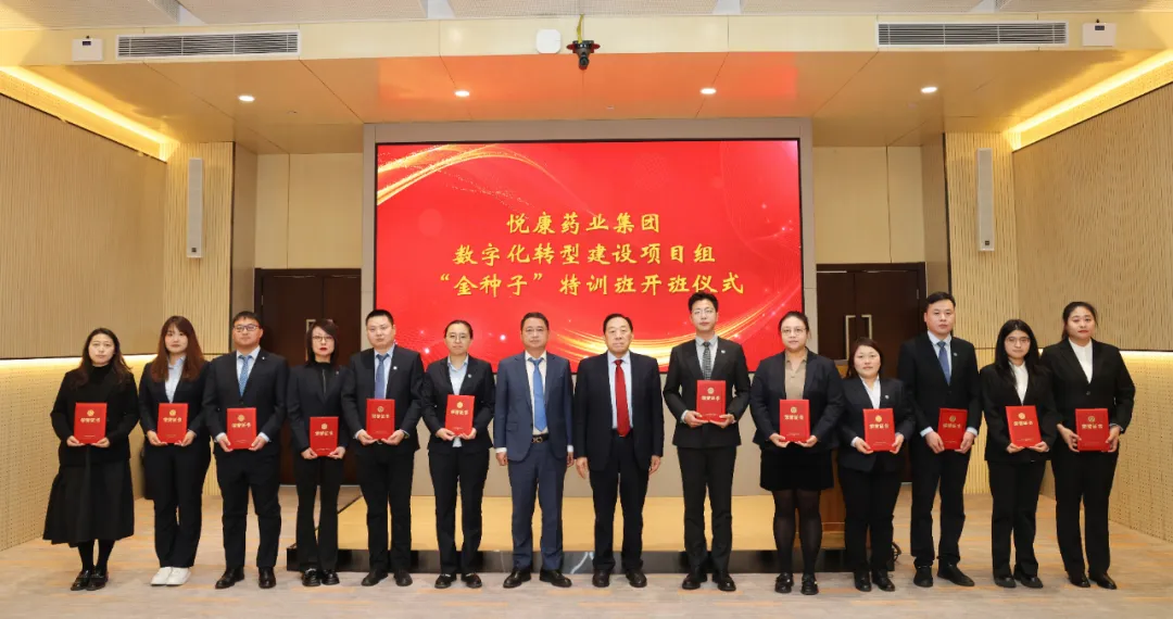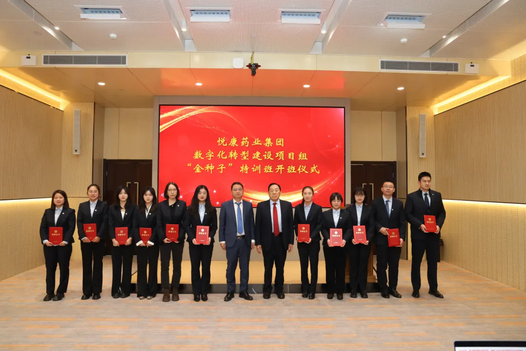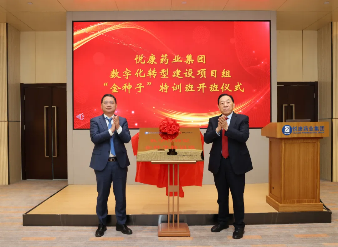 会上隆重举行了悦康数字化转型建设项目组“金种子”特训班开班仪式,悦康药业董事长于伟仕和华为制造行业总裁杨萍共同为特训班揭牌,并为首批“金种子”人才颁发证书。