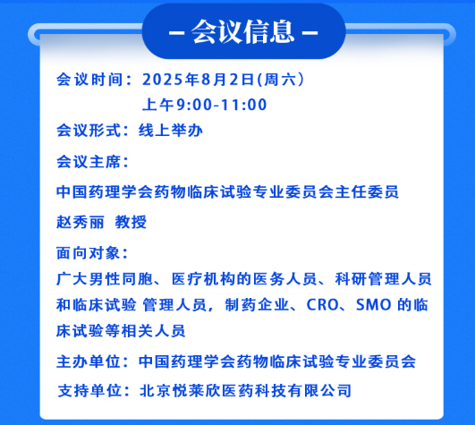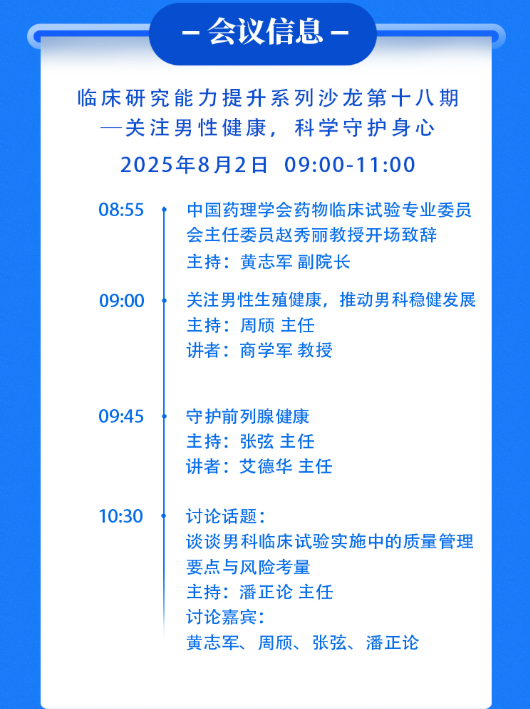 社会高速运转下,作为家庭与社会“顶梁柱”的男性群体,其身心健康正面临严峻挑战,却往往在“强者”标签下被选择性忽视。2025年8月2日,中国药理学会药物临床试验专业委员会第十八期临床研究能力提升沙龙将以“关注男性健康,科学守护身心”为主题,在线上重磅召开。本次沙龙由北京悦莱欣医药科技有限公司支持,来自产业力量的深度参与,彰显了“产学研”协同机制在加速成果转化中的关键作用。